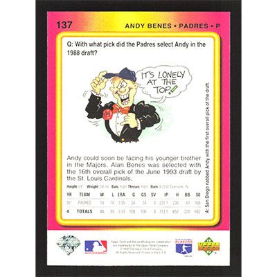 This is a 1993 Fun Pack Andy Benes baseball card. The card is #137 and pictures show condition.
