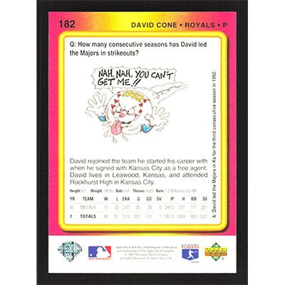This is a 1993 Fun Pack David Cone baseball card. The card is #182 and pictures show condition.