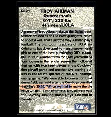This is a 1993 Heads & Tails SB XXVII Troy Aikman football card. The card is #SB21 and is in NM-MT condition.