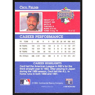 This is a 1993 Hostess Cecil Fielder baseball card. The card is #16 and pictures show condition.