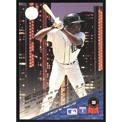 This is a 1993 Leaf Milt Cuyler baseball card. The card is #38 and pictures show condition.