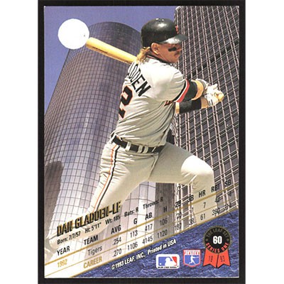 This is a 1993 Leaf Dan Gladden baseball card. The card is #60 and pictures show condition.