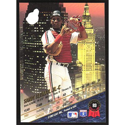 This is a 1993 Leaf Sandy Alomar Jr. baseball card. The card is #83 and pictures show condition.