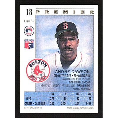 This is a 1993 O-Pee-Chee Premier Andre Dawson baseball card. The card is #18 and pictures show condition.