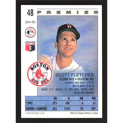 This is a 1993 O-Pee-Chee Premier Scott Fletcher autographed baseball card. This card has been signed, in blue, by Scott Fletcher, and is guaranteed authentic by Ballcardz.com. The card is #48 and pictures show condition.