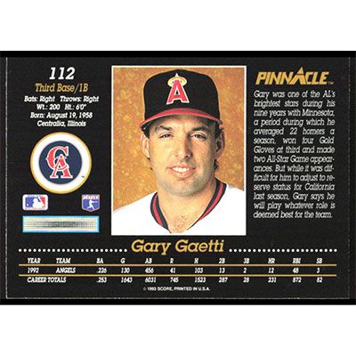 This is a 1993 Pinnacle Gary Gaetti baseball card. The card is #112 and pictures show condition.