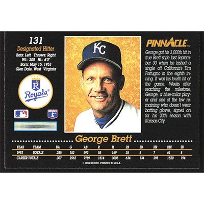 This is a 1993 Pinnacle George Brett baseball card. The card is #131 and pictures show condition.