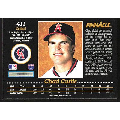 This is a 1993 Pinnacle Chad Curtis baseball card. The card is #411 and pictures show condition.