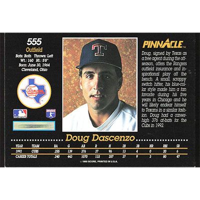 This is a 1993 Pinnacle Doug Dascenzo baseball card. The card is #555 and pictures show condition.