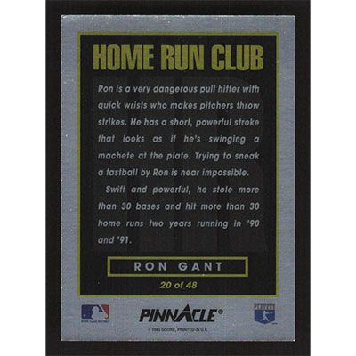 This is a 1993 Pinnacle Home Run Club Ron Gant baseball card. The card is #20 and pictures show condition.