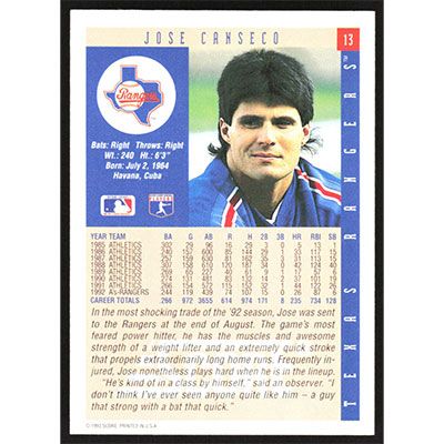 This is a 1993 Score Jose Canseco baseball card. The card is #13 and pictures show condition.