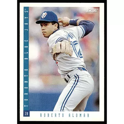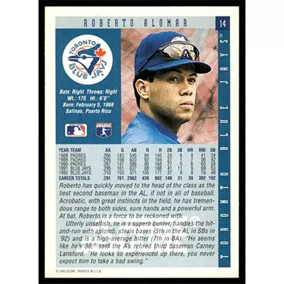 This is a 1993 Score Roberto Alomar baseball card. The card is #14 and pictures show condition.