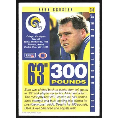 This is a 1993 Score Bern Brostek football card. The card is #339 and pictures show condition.