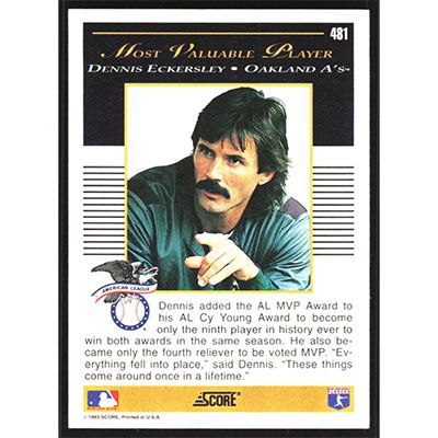 This is a 1993 Score Dennis Eckersley Award Winner baseball card. The card is #481 and pictures show condition.