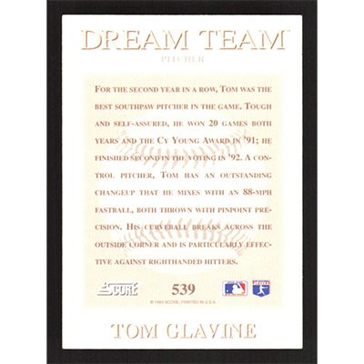 This is a 1993 Score Tom Glavine Dream Team baseball card. The card is #539 and pictures show condition.