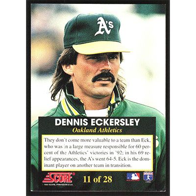 This is a 1993 Score The Franchise Dennis Eckersley baseball card. The card is #11 and pictures show condition.