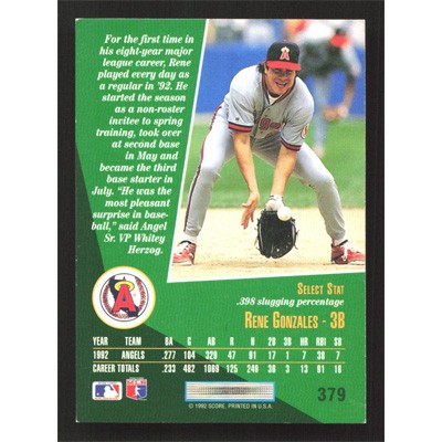 This is a 1993 Select Rene Gonzales baseball card. The card is #379 and pictures show condition.