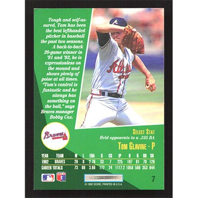 This is a 1993 Select Tom Glavine baseball card. The card is #7 and pictures show condition.