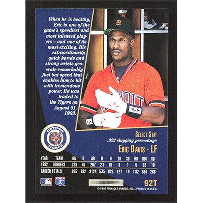 This is a 1993 Select Rookie/Traded Eric Davis baseball card. The card is #92T and pictures show condition.