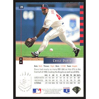 This is a 1993 SP Chili Davis baseball card. The card is #20 and pictures show condition.