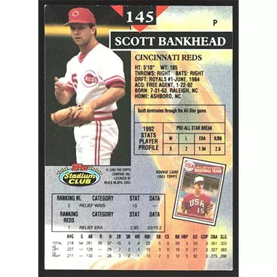 This is a 1993 Stadium Club Scott Bankhead baseball card. The card is #145 and pictures show condition.