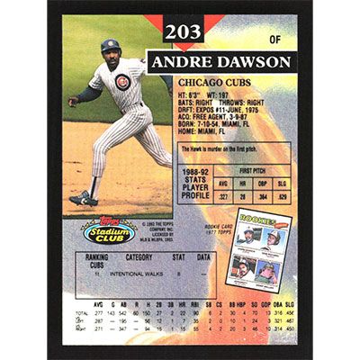 This is a 1993 Stadium Club Andre Dawson baseball card. The card is #203 and pictures show condition.