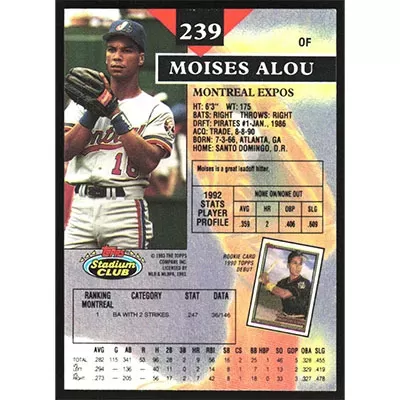 This is a 1993 Stadium Club Moises Alou baseball card. The card is #239 and pictures show condition.