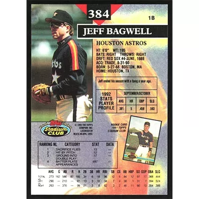 This is a 1993 Stadium Club Jeff Bagwell baseball card. The card is #384 and pictures show condition.