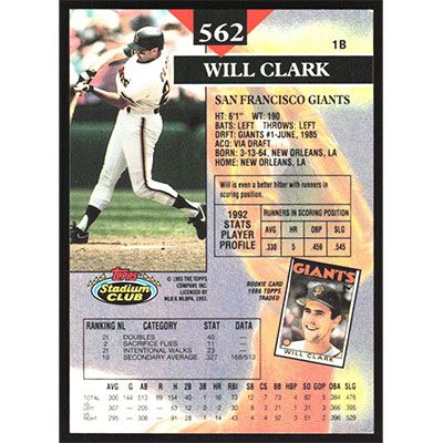 This is a 1993 Stadium Club Will Clark baseball card. The card is #562 and pictures show condition.