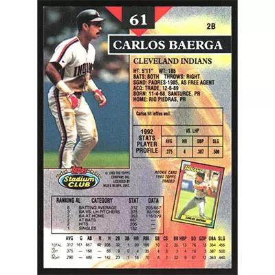 This is a 1993 Stadium Club Carlos Baerga baseball card. The card is #61 and pictures show condition.