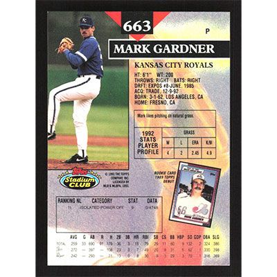 This is a 1993 Stadium Club Mark Gardner baseball card. The card is #663 and pictures show condition.