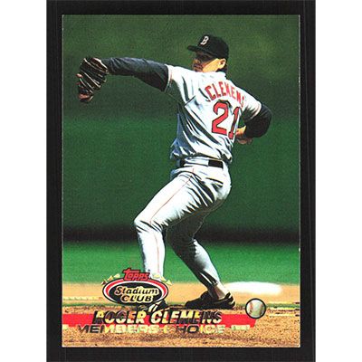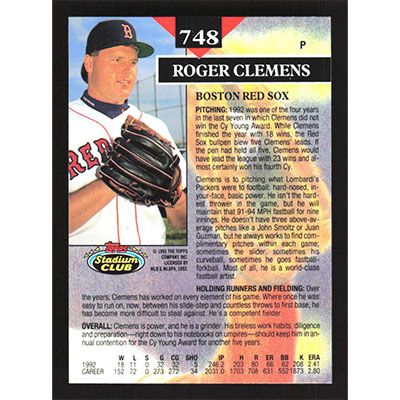 This is a 1993 Stadium Club Roger Clemens Members Choice baseball card. The card is #748 and pictures show condition.