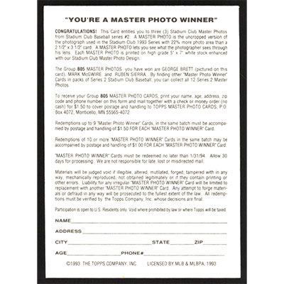 This is a 1993 Stadium Club Master Photos Winner Redemptions George Brett baseball card. The card is #NNO and pictures show condition. Team(s): Kansas City Royals
