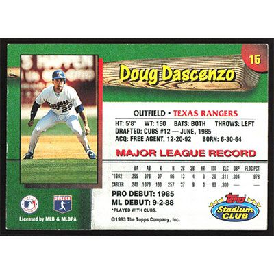 This is a 1993 Stadium Club Team Doug Dascenzo baseball card. The card is #15 and pictures show condition.