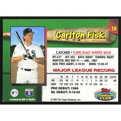 This is a 1993 Stadium Club Team Carlton Fisk baseball card. The card is #16 and pictures show condition.