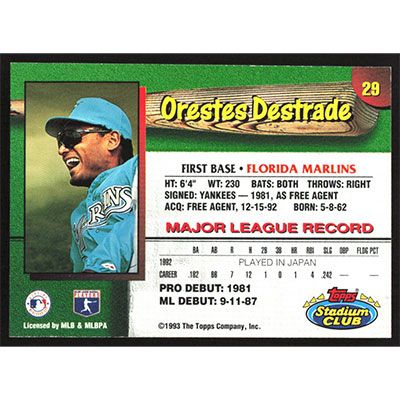 This is a 1993 Stadium Club Team Orestes Destrade baseball card. The card is #29 and pictures show condition.