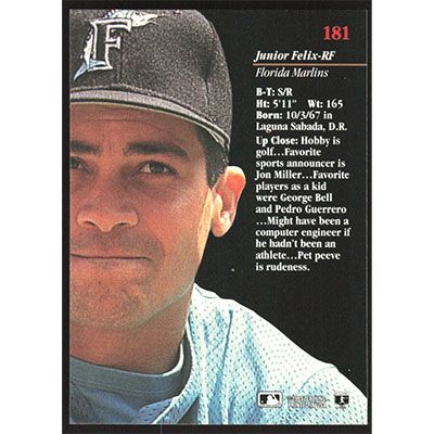 This is a 1993 Studio Junior Felix baseball card. The card is #181 and pictures show condition.