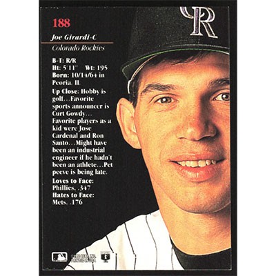 This is a 1993 Studio Joe Girardi baseball card. The card is #188 and pictures show condition.