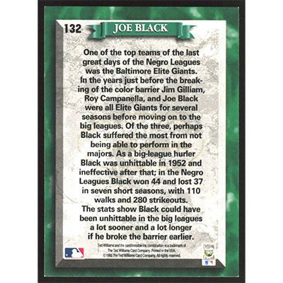 This is a 1993 Ted Williams Joe Black Barrier Breakers baseball card. The card is #132 and pictures show condition.