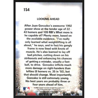 This is a 1993 Ted Williams Juan Gonzalez Dawning of a Legacy Looking Ahead baseball card. The card is #154 and pictures show condition. Team(s): Texas Rangers