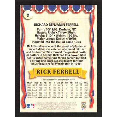 This is a 1993 Ted Williams Rick Ferrell baseball card. The card is #2 and pictures show condition.