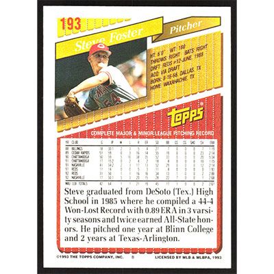 This is a 1993 Topps Steve Foster baseball card. The card is #193 and pictures show condition.