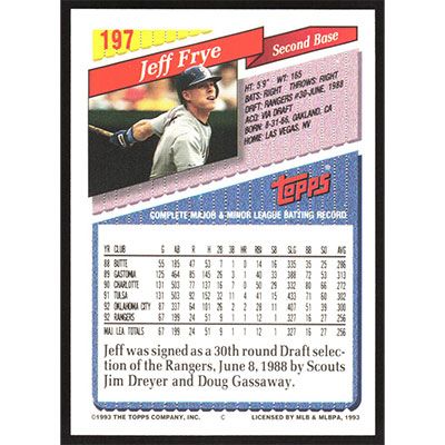 This is a 1993 Topps Jeff Frye baseball card. The card is #197 and pictures show condition.