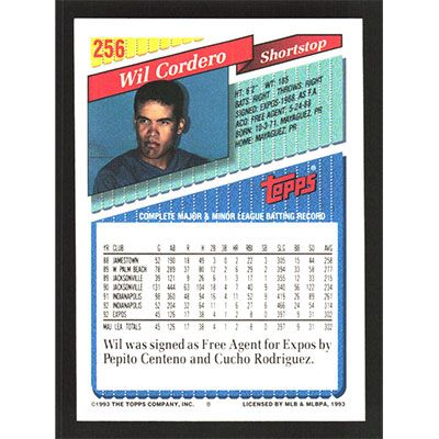This is a 1993 Topps Wil Cordero baseball card. The card is #256 and pictures show condition.