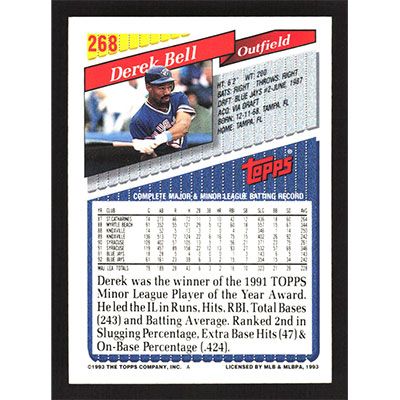 This is a 1993 Topps Derek Bell baseball card. The card is #268 and pictures show condition.