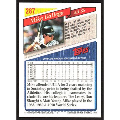 This is a 1993 Topps Mike Gallego baseball card. The card is #287 and pictures show condition.