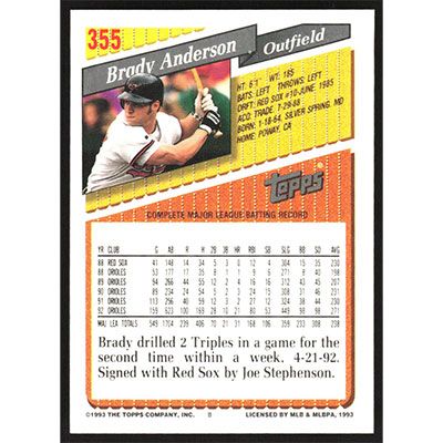 This is a 1993 Topps Brady Anderson baseball card. The card is #355 and pictures show condition.