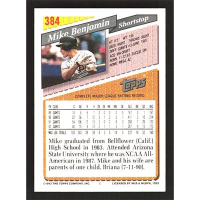 This is a 1993 Topps Mike Benjamin baseball card. The card is #384 and pictures show condition.