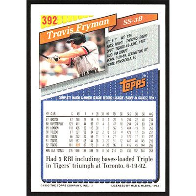 This is a 1993 Topps Travis Fryman baseball card. The card is #392 and pictures show condition.
