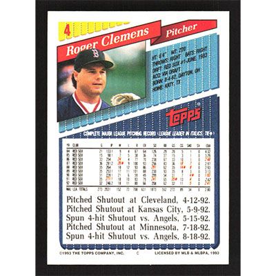 This is a 1993 Topps Roger Clemens baseball card. The card is #4 and pictures show condition.